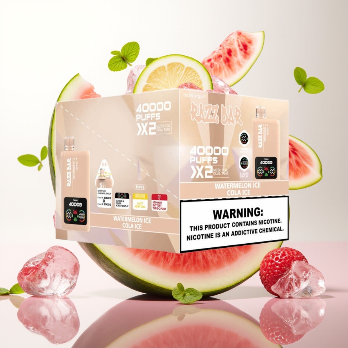 Razz Bar 40000 Puffs Engangs Vape – Vannmelon Is & Cola Is – 40000 Puffs, 1.0Ω×2 Mesh Coil, 650 mAh, Type-C