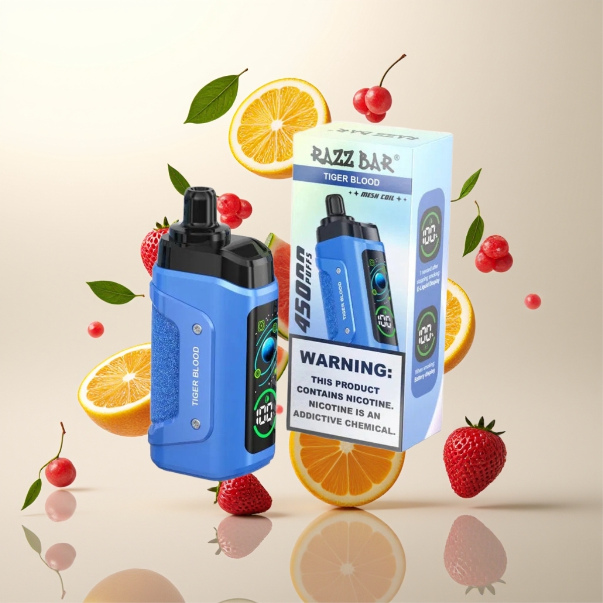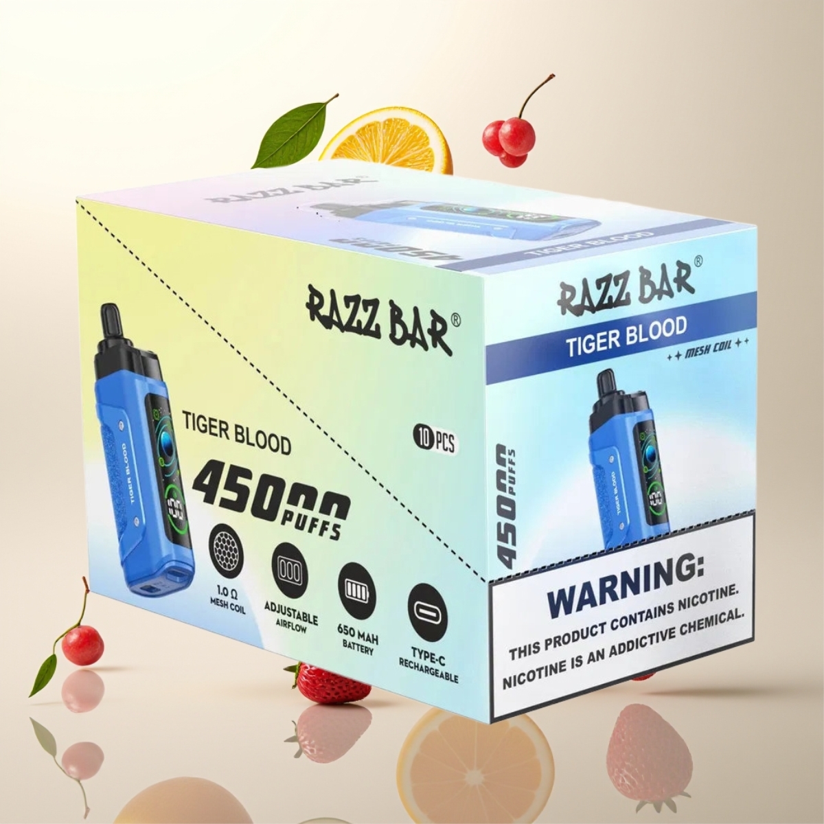 Razz Bar 45000 Puffs Engangs Vape Tiger Blod – 45000 Puff, 1.0 Ohm Mesh, Justerbar Luftstrøm